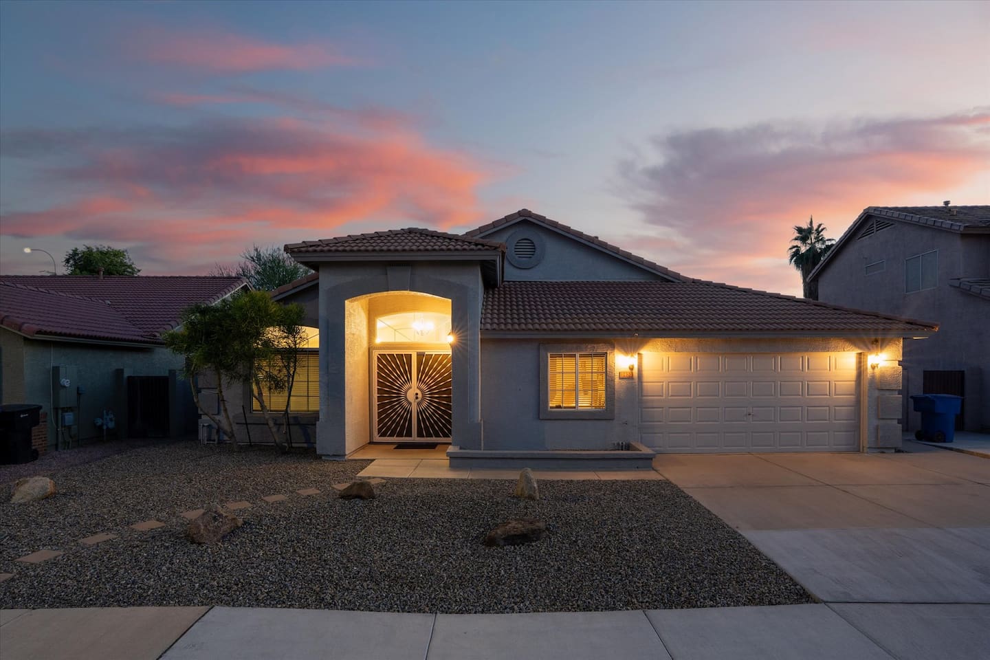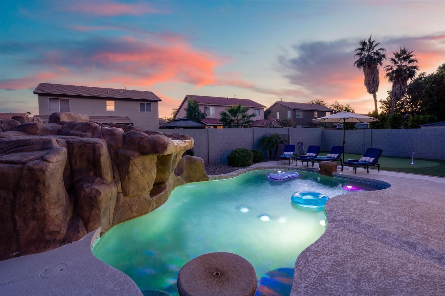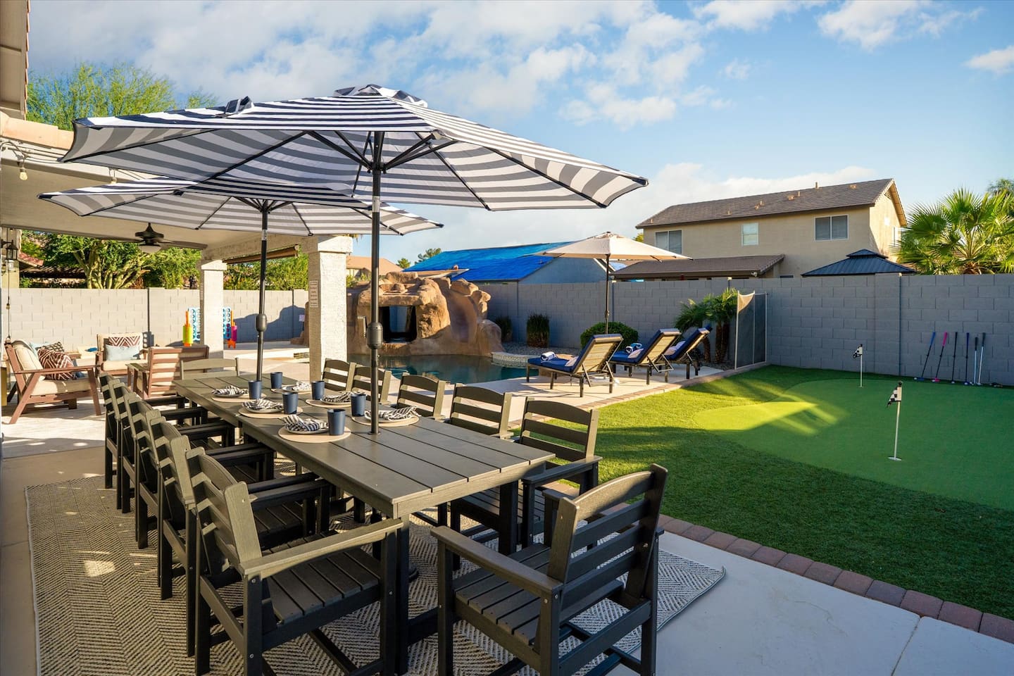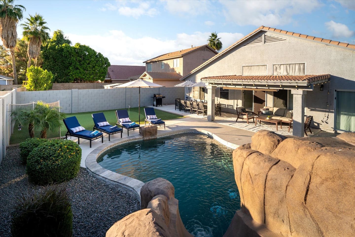 Top 3 Guest Compliments (From Other Platforms) - Incredible backyard with a grotto pool, slide, and games - Excellent setup for families with kids and babies - Fast, responsive host and smooth check-in experience The Perfect Home for Family Gatherings & Group Trips Whether you’re planning a multi-generational family getaway, traveling with kids or babies, or visiting for a golf or tournament weekend, this Chandler home is designed for comfort, fun, and easy living. From the resort-style backyard to the fully stocked kitchen, everything is thoughtfully set up so you can relax and enjoy time together. Sleeping Arrangements – 5 Bedrooms - Primary Suite: King bed, desk, 55” TV, soaking tub, and walk-in shower - Junior Suite: Queen bed, 55” TV, ensuite bathroom - Bedroom 3: Queen bed - Bedroom 4: Two full beds - Bedroom 5: Queen bed All bedrooms include premium linens, charging cables, closets, and luggage racks. All bathrooms include: Bath towels, hand towels, washcloths, makeup remover cloths, hair dryers, shampoo, conditioner, body wash, and hand soap. Pool & Spa Information Heating: - Pool & Spa: $55/night - Hot Tub Only: $15/night - Request at least 48 hours before check-in Hot Tub (Spa Mode): Runs on-demand (not always on). Turn on using the control panel and switch back to Regular Mode when finished. - Up to 101°F - Heats in approximately 15–60 minutes depending on starting water temperature A step-by-step guide for the pool, slide, and hot tub is available at the property. Safety: - Pool fence available upon request - Use at your own risk - Children must be supervised Resort-Style Backyard - Free-form pool with grotto, waterfall, and water slide - Cave-style hot tub inside the grotto - Putting green with LED lights and glow balls - Fire pit with Adirondack seating - Outdoor dining table for 12 - Covered patio lounge - Gas BBQ grill - Beach towels provided Game Room - 4-player arcade with 15,000 games - Shuffleboard and foosball - Board games - 55” wall-mounted Smart TV Living Room - 75” Smart TV - Oversized sectional sofa with ottoman - Open-concept layout with kitchen and pool views - Coffee table Kitchen & Dining - Fully equipped kitchen with large island - Spacious countertops and cabinets - Gas stovetop, oven, and microwave - 4 slice toaster - Blender and mixer - Air fryer and crockpot - Rice cooker - Keurig and drip coffee makers - Refrigerator/freezer plus extra refrigerator in the garage - Dishwasher - Sink with purified water tap - Trays, serving dishes, kid-friendly dishes, glasses, outdoor plates and cups, and silverware - Pots, pans, and basic spices - Dining table seating for 10+ Baby-Friendly Amenities - Two Pack ’n Play cribs with freshly washed sheets (upon request) - Two high chairs - Pool safety fence (guest setup and removal required) Pet Policy - One dog only - Pet fee: $300 per stay - Fully fenced backyard - Two parks within a 5–7 minute walk for dog walking Pet Rules: No bathroom use anywhere in the backyard Dogs are not allowed on beds If dogs are on the couch, please use the provided throw blankets Guests are responsible for all pet-related cleaning and any damage We truly appreciate your cooperation Licenses - Arizona TPT License #21629643 - City of Chandler License #310664 Quiet Hours & Neighborhood Our home is located in a quiet and peaceful Chandler neighborhood. Please observe quiet hours from 9:00 PM to 8:00 AM. No Smoking or Illegal Substances Smoking or vaping is not allowed anywhere on the property, indoors or outdoors. Any evidence of smoking will result in a $700 additional deep cleaning fee. Maintenance & Trash Collection The pool and hot tub are professionally serviced once a week (currently on Thursdays), and landscaping is maintained as needed Trash bins are moved on Mondays and Wednesdays We respect your privacy and want you to feel at home. If you need anything, I’m just a couple of miles away and happy to help. You can message or call me anytime, and I’ll do my best to assist promptly.